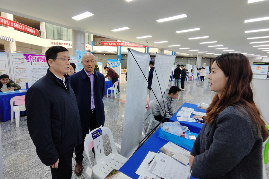 商亮來到丹陽市人才服務中心現場設立的人才政策推介展位,聽取人才服務中心同志關于丹陽市人才引進政策和吸引大學生求職就業的政策介紹。在現場走訪過程中,商亮與參會用人單位進行了交流,了解企業生產發展和招聘需求變化,聽取企業對畢業生專業技能和職業能力的要求。商亮來到“訪企拓崗”走訪單位上市企業江蘇魚躍醫療設備股份有限公司的招聘展位,了解魚躍醫療校園招聘的崗位、人數和要求等情況,與招聘工作人員進行了交流。商亮指出校園招聘活動要鞏固“訪企拓崗”成果、強化學校與走訪單位的主動精準對接,發揮“訪企拓崗”優質單位吸納畢業生就業的優勢,把“訪企拓崗”工作做細做實,力求實效。商亮還與現場求職的畢業生親切交談,鼓勵畢業生抓住“春季攻堅”校園招聘重要求職期,爭取早日順利就業。在濱海縣教育局編制教師報名招聘現場,商亮向教育局工作人員了解出生人口變化對教師招聘的影響,了解師范生就業求職情況。
