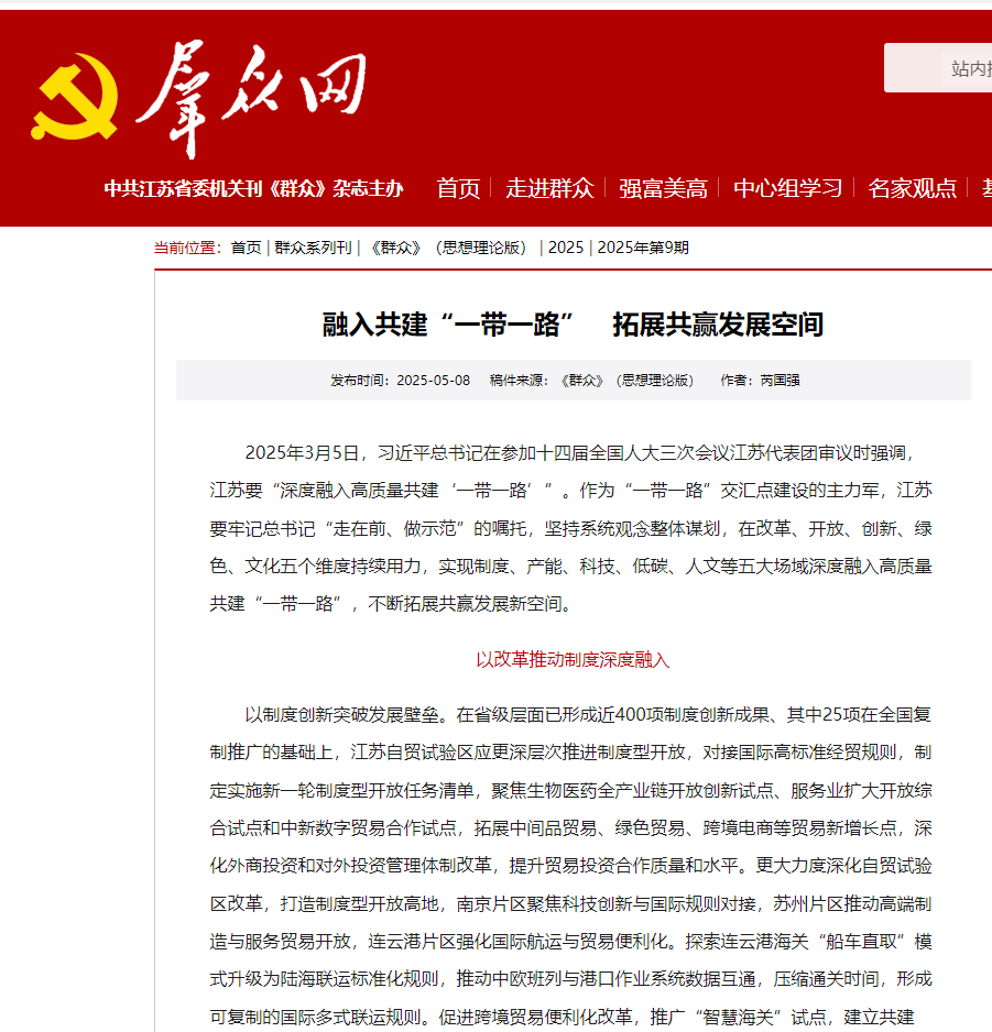 2025年3月5日,習(xí)近平總書記在參加十四屆全國人大三次會議江蘇代表團(tuán)審議時強(qiáng)調(diào),江蘇要“深度融入高質(zhì)量共建‘一帶一路’”。作為“一帶一路”交匯點建設(shè)的主力軍,江蘇要牢記總書記“走在前、做示范”的囑托,堅持系統(tǒng)觀念整體謀劃,在改革、開放、創(chuàng)新、綠色、文化五個維度持續(xù)用力,實現(xiàn)制度、產(chǎn)能、科技、低碳、人文等五大場域深度融入高質(zhì)量共建“一帶一路”,不斷拓展共贏發(fā)展新空間。