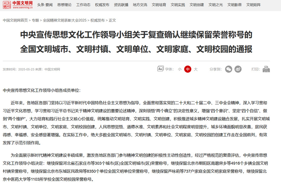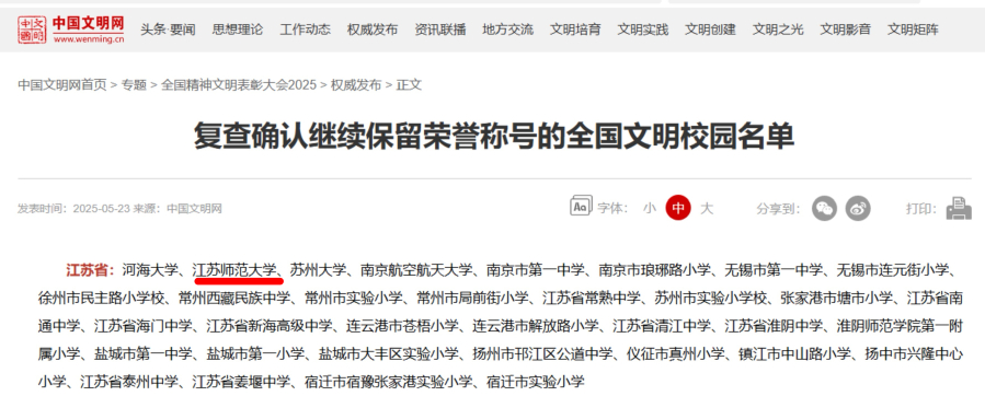 5月23日,全國精神文明建設(shè)表彰大會(huì)在京召開,習(xí)近平總書記對精神文明建設(shè)工作作出重要指示。會(huì)上公布了第七屆全國文明城市、文明村鎮(zhèn)、文明單位,第三屆全國文明家庭、文明校園,經(jīng)嚴(yán)格規(guī)范的復(fù)查評估,我校確認(rèn)繼續(xù)保留“全國文明校園”榮譽(yù)稱號。