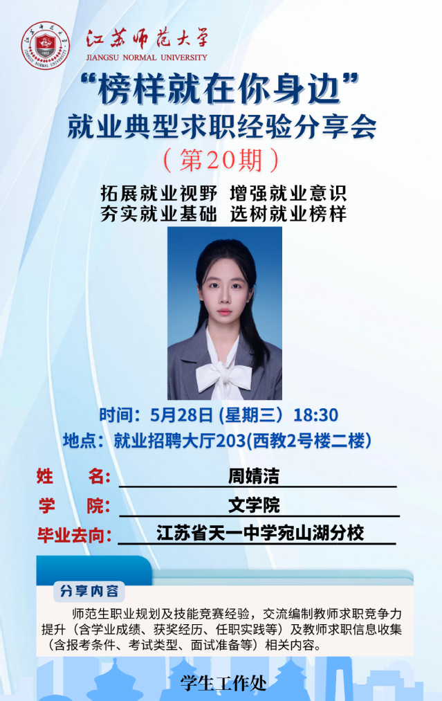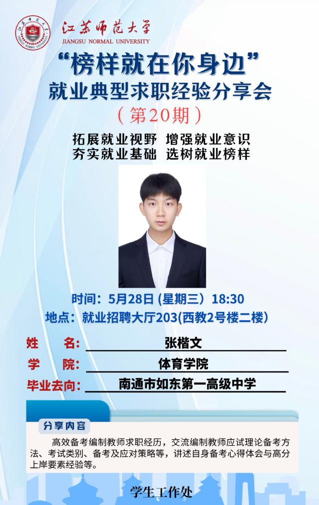 為增強學(xué)生就業(yè)意識,拓寬就業(yè)視野,夯實就業(yè)基礎(chǔ),學(xué)生工作處結(jié)合學(xué)生關(guān)注度高、求職意愿強烈的行業(yè)領(lǐng)域,開展“榜樣就在你身邊”2025屆畢業(yè)生就業(yè)典型求職經(jīng)驗分享系列活動,充分發(fā)揮朋輩榜樣的示范引領(lǐng)作用,幫助更多的學(xué)生提升就業(yè)競爭力。經(jīng)學(xué)院推薦、學(xué)校遴選,現(xiàn)將第二十期活動開展相關(guān)情況通知如下: