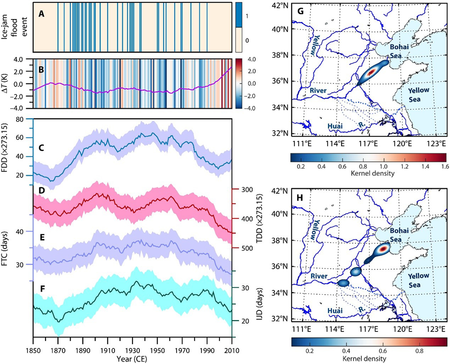 近日,我校地理測繪與城鄉規劃學院環境演變研究團隊以唯一通訊作者單位和第一作者單位在國際頂級期刊《Science Advances》上發表了一項突破性研究成果,系統揭示了黃河下游凌汛洪水在過去160年中的時空演變規律及其對全球變暖的響應機制。這一研究不僅為寒區河流洪水管理提供了全新的理論框架,還為相關政策制定和防災減災工作提供了重要科學依據。