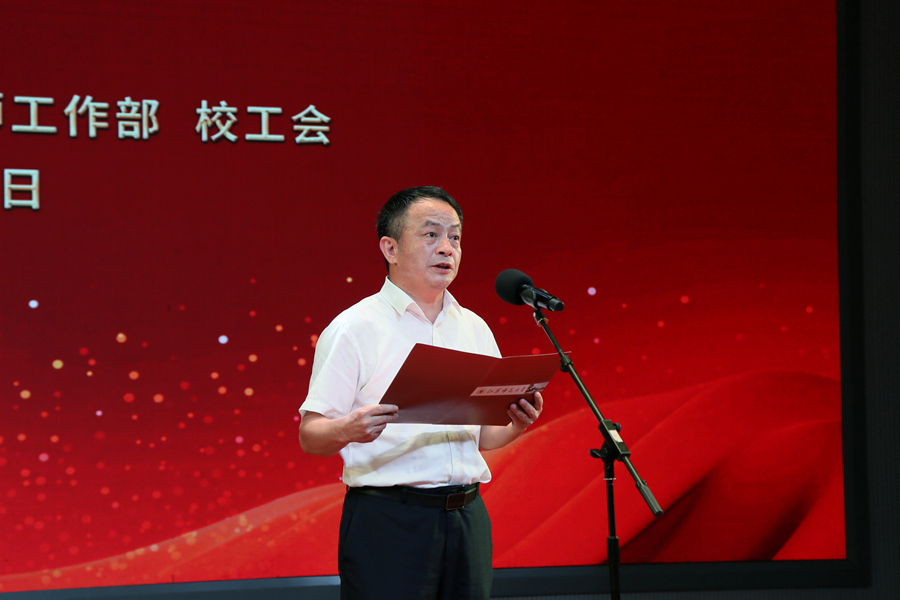 校黨委書記芮國強在表彰大會上講話,代表校黨委向辛勤耕耘在教學、科研、管理、服務一線的全體教職員工和離退休教師致以節日的問候和崇高的敬意,向新入職的教師表示熱烈的歡迎,向受到表彰的先進集體和優秀個人表示衷心的祝賀。芮國強指出,過去的一年,全體教職員工深入學習貫徹習近平總書記關于教育的重要論述,深入推進“一融雙高”,聚力推進“改革、拓展、轉型、提檔”,各項事業取得顯著成效。站在新的起點,我們要體悟教育家精神,鑄牢強師之魂。要踐行教育家精神,扛起強國之責。要弘揚教育家精神,貢獻發展之力。要以教育家精神為引領,以先進典型為榜樣,以昂揚的斗志、務實的作風、創新的精神,奮力推進學校高水平大學建設,在教育強國建設的偉大實踐中書寫師大新華章。