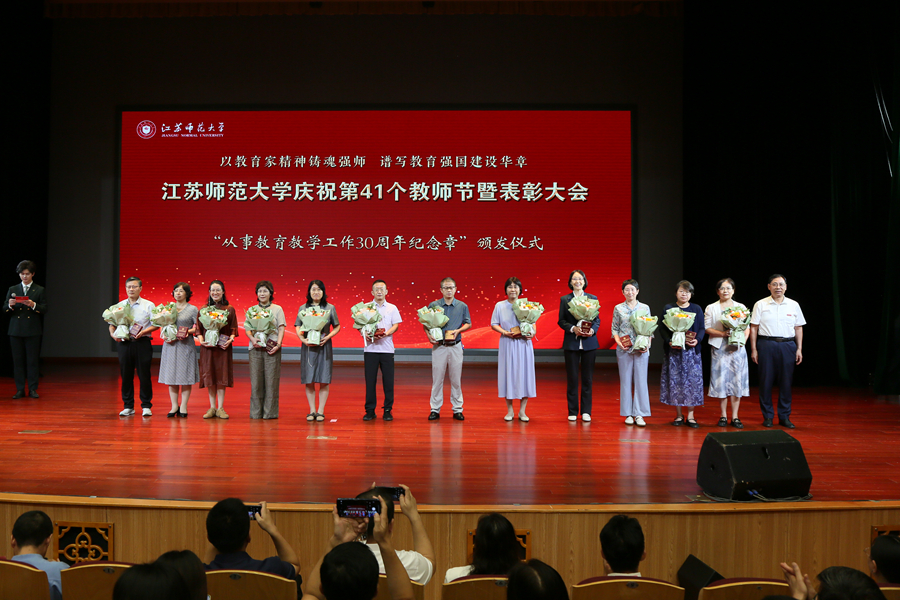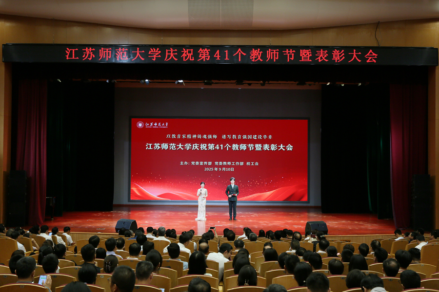 9月10日下午,江蘇師范大學舉辦“以教育家精神鑄魂強師,譜寫教育強國建設華章”為主題的慶祝第41個教師節暨表彰大會。在校全體校領導、江蘇省教育基金會副秘書長張虎成、各學院黨政負責人、機關部門和直屬單位主要負責人、教師代表、接受表彰的先進集體和個人代表、從事教育教學30周年教師代表、退休教師代表、新入職教師和學生代表參加表彰大會。