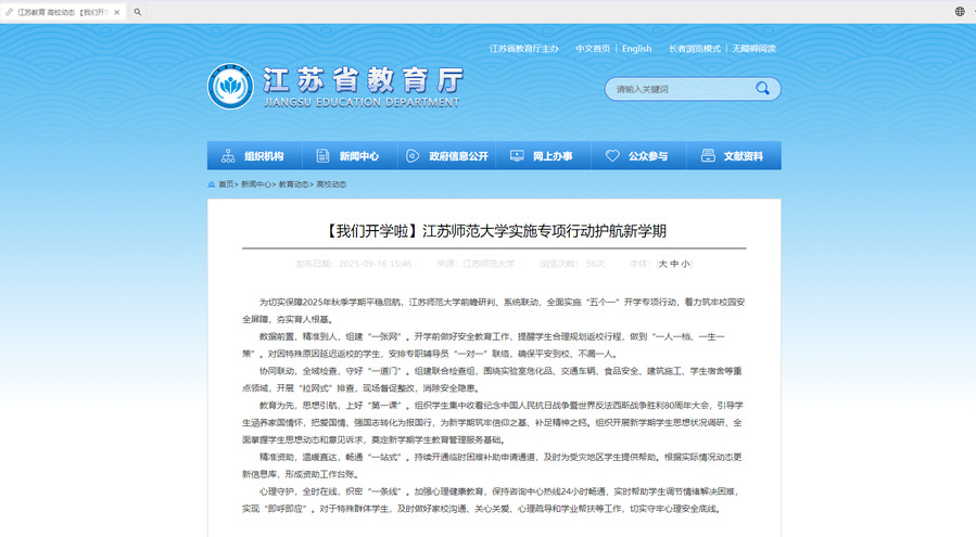 江蘇省教育廳官方網(wǎng)站9月16日關(guān)注我校新學(xué)期專(zhuān)項(xiàng)行動(dòng)開(kāi)展情況,內(nèi)容如下: