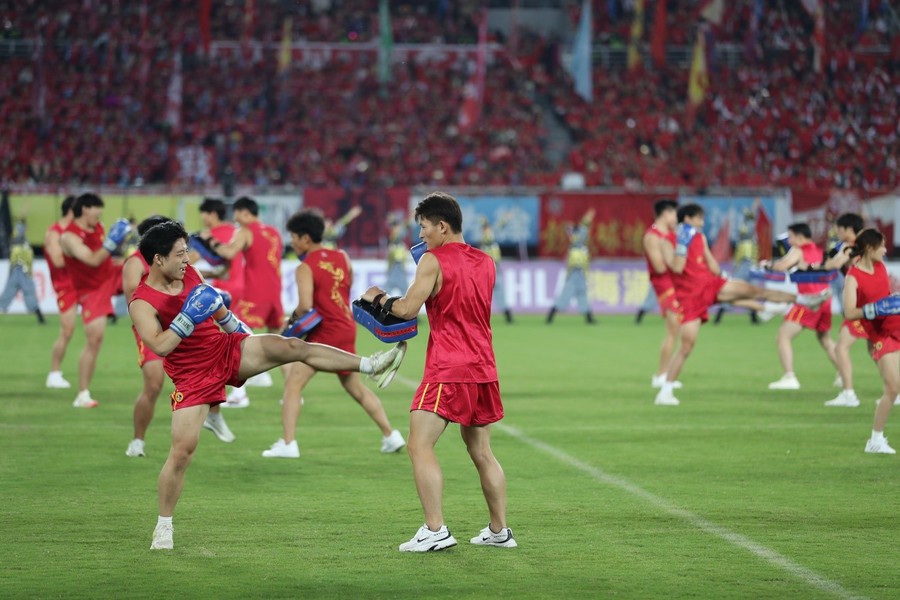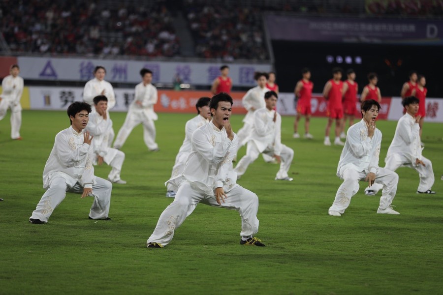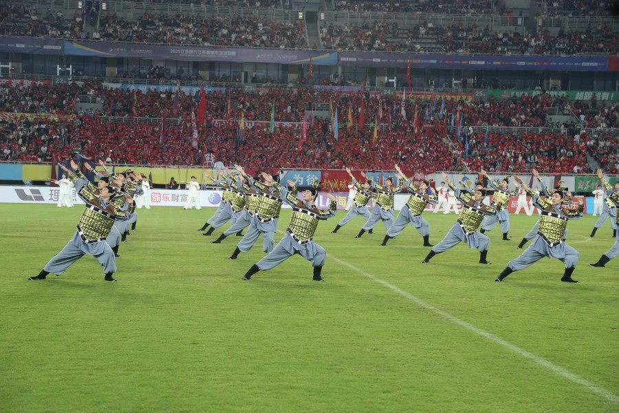 9月20日晚,“蘇超”聯(lián)賽第12輪徐州隊(duì)與蘇州隊(duì)的比賽在徐州奧體中心拉開帷幕。開賽前夕,169名江蘇師范大學(xué)學(xué)子以一場(chǎng)氣勢(shì)恢宏的《大漢雄風(fēng)》表演,將現(xiàn)場(chǎng)氛圍推向首個(gè)高潮。這場(chǎng)長(zhǎng)達(dá)7分鐘的表演,將中華武術(shù)與兵馬俑舞元素深度融合,以?“武魂起,俑魄生”為核心理念,通過(guò)剛猛凌厲的武技與雄渾厚重的舞姿,生動(dòng)再現(xiàn)了古代戰(zhàn)場(chǎng)的豪情。刀光隨鼓點(diǎn)流轉(zhuǎn),陣型隨韻律變幻,動(dòng)靜之間,令現(xiàn)場(chǎng)數(shù)萬(wàn)名觀眾沉浸于跨越時(shí)空的文化震撼,更彰顯出徐州作為兩漢文化發(fā)源地的深厚底蘊(yùn)。