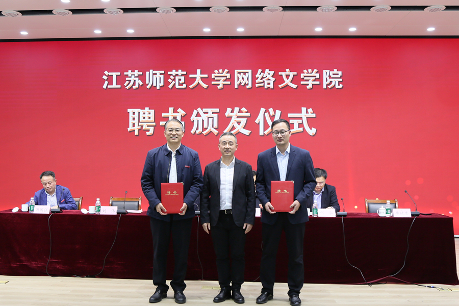 成立儀式上,校地雙方簽署共建協議,共同為“江蘇師范大學網絡文學院”揭牌。劉偉為網絡文學院院長黃德志、執行院長溫德朝頒發聘書。