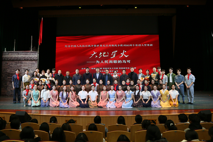 為紀念中國人民抗日戰爭暨世界反法西斯戰爭勝利80周年,弘揚愛國主義精神,引導青年學生堅定理想信念,11月18日晚,由黨委宣傳部、黨委學生工作部、黨委研究生工作部主辦,音樂學院承辦的大型原創舞劇《大地星火——為人民而歌的馬可》在馬可音樂廳成功演出。舞劇以徐州籍人民音樂家馬可的光輝一生與不朽藝術為主線、以傳承和弘揚“南泥灣精神”“延安精神”為內核、以謳歌教育家精神和育人實效為目的,為全校師生獻上一場貫通歷史與當下的精彩表演。校黨委副書記蔡國春蒞臨演出現場,來自全校各學院400余名師生觀看演出。