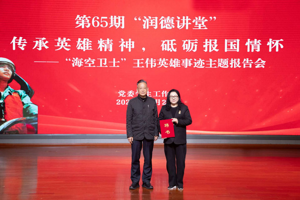 11月27日下午,第65期“潤德講堂”在馬可音樂廳順利舉行。“海空衛(wèi)士”王偉烈士的妻子、原海軍上校阮國琴以“傳承英雄精神,砥礪報國情懷”為核心,分享了王偉烈士的英雄事跡與精神傳承,與師生共同緬懷先烈、汲取奮進力量。
