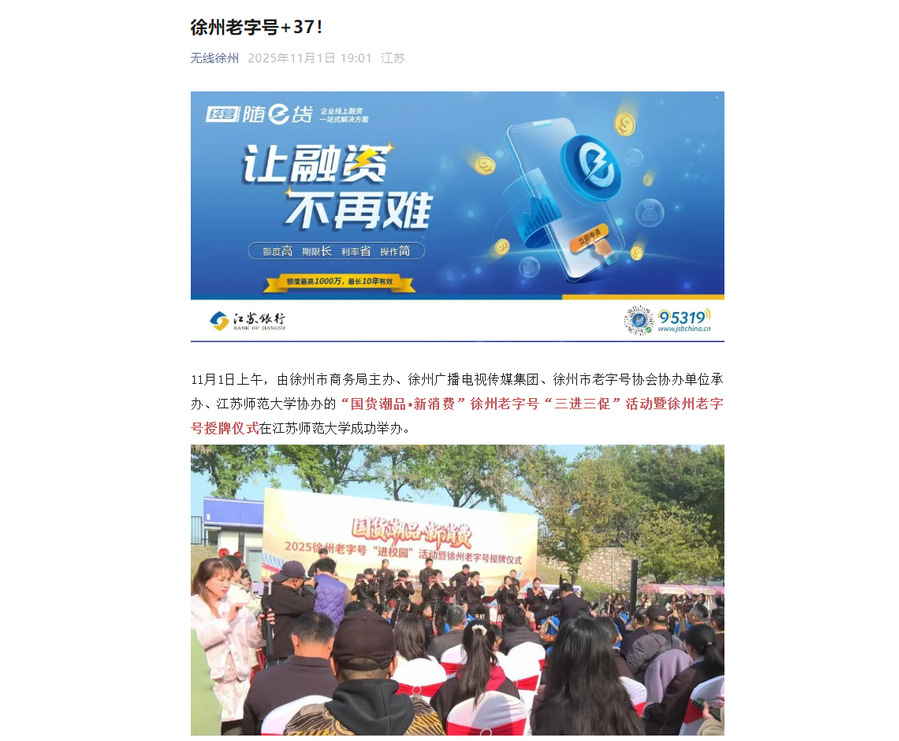 徐州廣電“無線徐州”11月1日?qǐng)?bào)道徐州老字號(hào)“三進(jìn)三促”活動(dòng)暨徐州老字號(hào)授牌儀式在江蘇師范大學(xué)成功舉辦,報(bào)道內(nèi)容如下:
