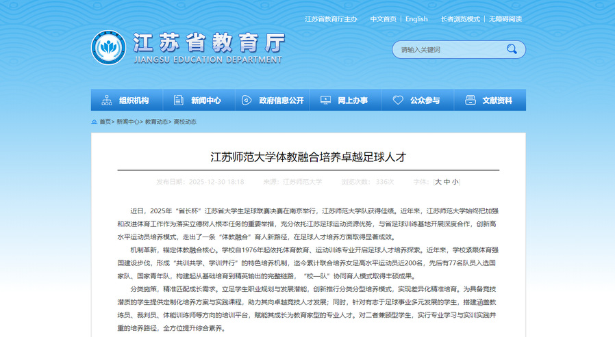 江蘇省教育廳官網(wǎng)12月30日發(fā)表我校體教融合培養(yǎng)卓越足球人才文章,內(nèi)容如下: