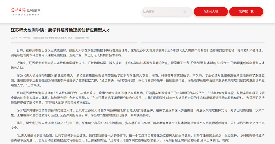 光明日報客戶端1月5日關(guān)注我校地理測繪與城鄉(xiāng)規(guī)劃學(xué)院跨學(xué)科培養(yǎng)地理類創(chuàng)新應(yīng)用型人才相關(guān)工作,報道內(nèi)容如下: