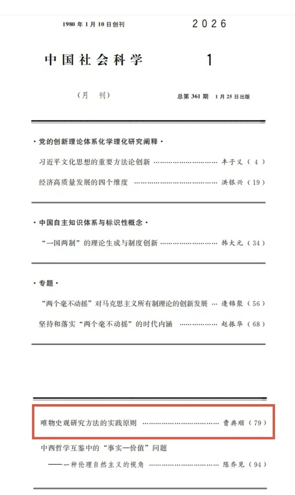 近日,我校馬克思主義學院曹典順教授的論文《唯物史觀研究方法的實踐原則》在人文社科領域頂級期刊《中國社會科學》2026年第1期正式發表。