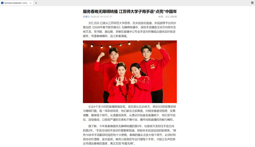 交匯點訊 記者從江蘇師范大學獲悉,在央視音樂頻道、央視頻等平臺同步推出的《2026年春節聯歡晚會》無障礙轉播中,該校手語播音主持方向研究生侯文龍、李沛穎、謝遠鵬、李敏在直播中以專業手語為聽障觀眾提供實時轉譯服務,傳遞春晚精彩,送上新春溫暖。