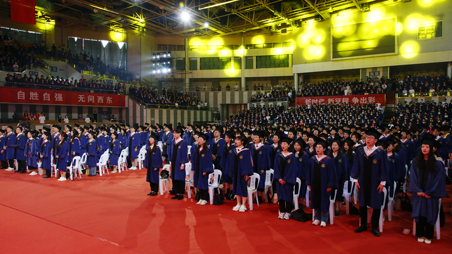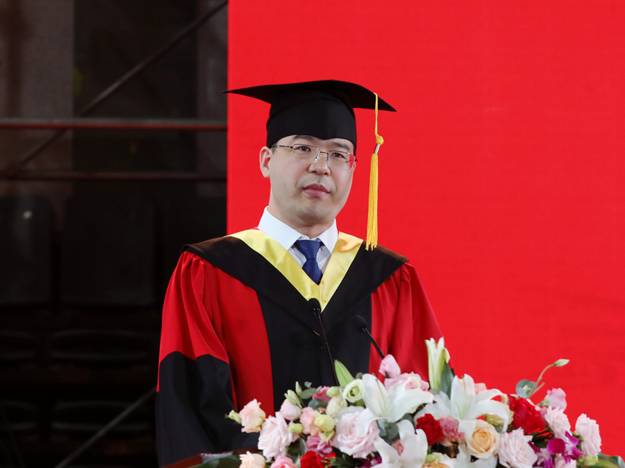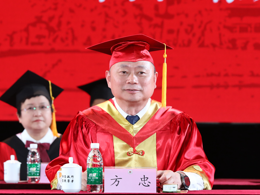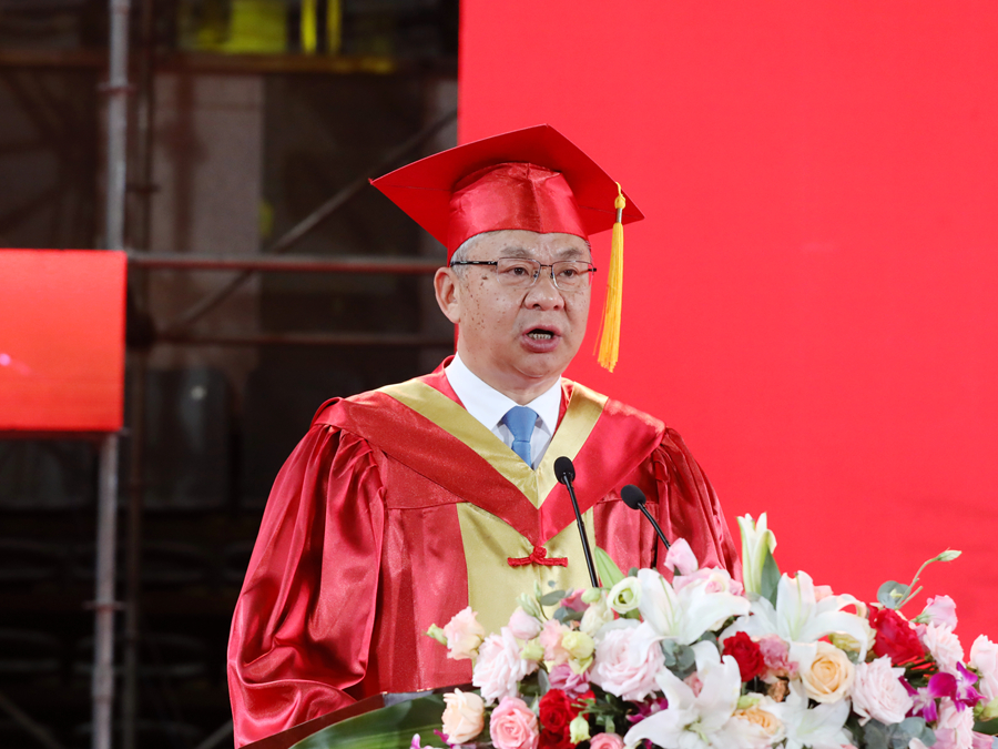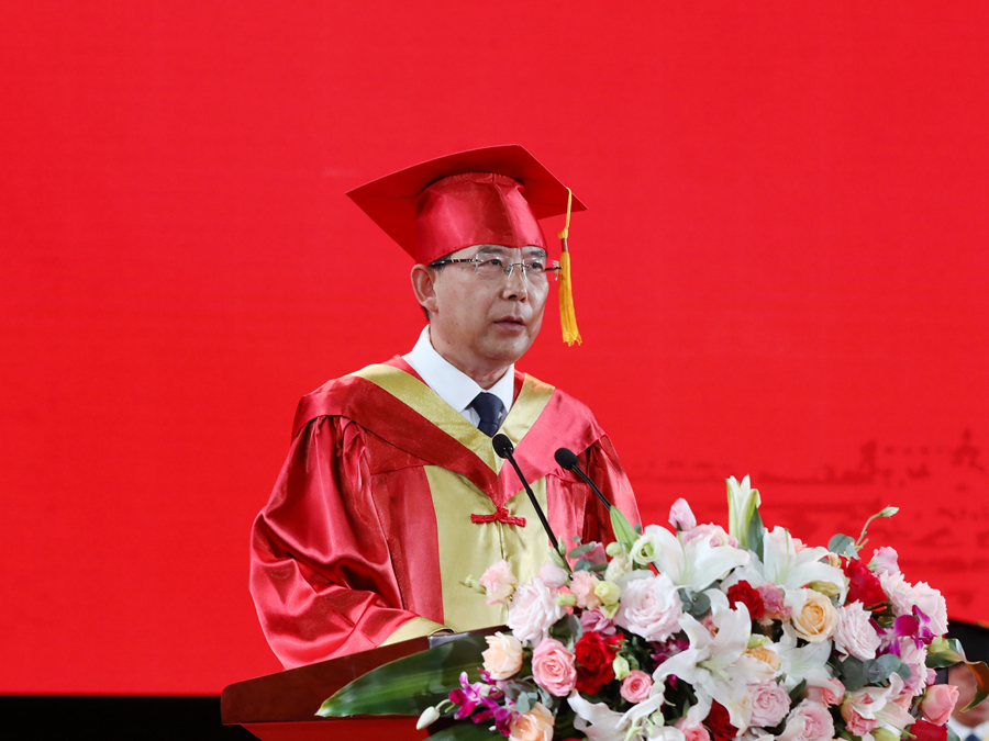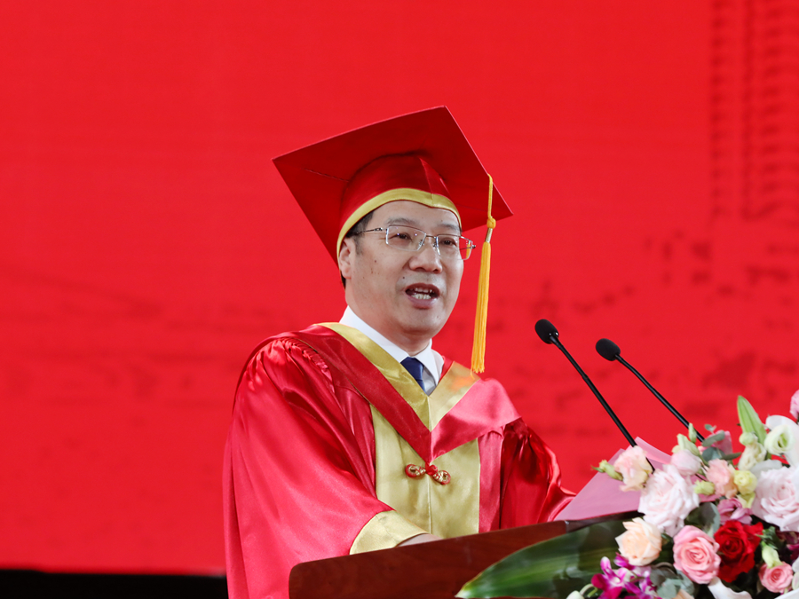 伴隨著莊嚴的國歌聲,畢業(yè)典禮正式開幕。校長、校學(xué)位評定委員會主席周汝光在典禮上致辭,代表學(xué)校向圓滿完成學(xué)業(yè)的畢業(yè)生們表示熱烈祝賀,向辛勤培育、陪伴支持畢業(yè)生的老師和家長致以衷心感謝。周汝光以“擦亮青春底色,唱響時代之音”為題,飽含深情地回顧了全體畢業(yè)研究生在讀期間取得的成績,充分肯定了大家在疫情防控期間與學(xué)校息息相通,甘苦與共,用實際行動關(guān)注支持學(xué)校事業(yè)發(fā)展作出的努力。他寄語全體畢業(yè)研究生,生逢偉大時代,不僅要學(xué)有所成,更要學(xué)有所思、學(xué)有所用,做持之以恒的自律者、堅韌不拔的奮斗者、矢志不渝的愛國者。周汝光勉勵全體畢業(yè)研究生要傳承好“崇德厚學(xué),勵志敏行”的校訓(xùn),心中有陽光,腳下有力量,篤行致遠、惟實勵新,不墜青云之志,創(chuàng)造無愧于時代的精彩人生。