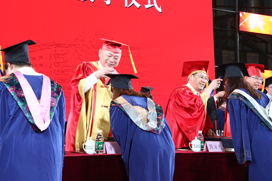 副校長、校學(xué)位評定委員會副主席蔡國春宣讀學(xué)位授予決定。校領(lǐng)導(dǎo)、校學(xué)位評定委員會委員為全體2023屆畢業(yè)研究生正冠撥穗并頒發(fā)學(xué)位證書。