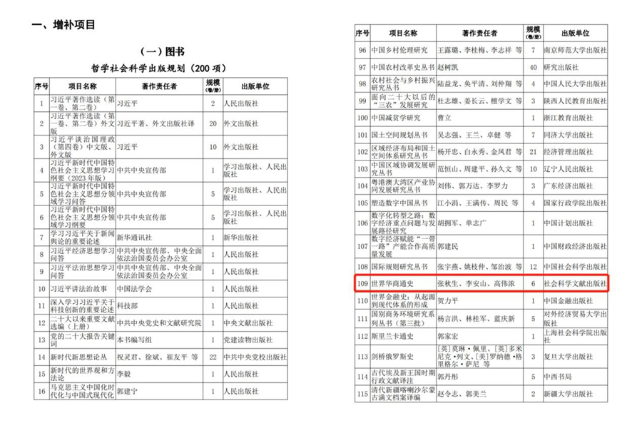 近日,國家新聞出版署印發了《關于公布“十四五”國家重點出版物出版規劃調整情況的通知》(國新出發【2023】12號),我校華僑華人研究/澳大利亞研究中心主任、歷史文化與旅游學院張秋生教授主持的國家社科基金重大項目《世界華商通史》被增補為國家“十四五”重點出版項目。