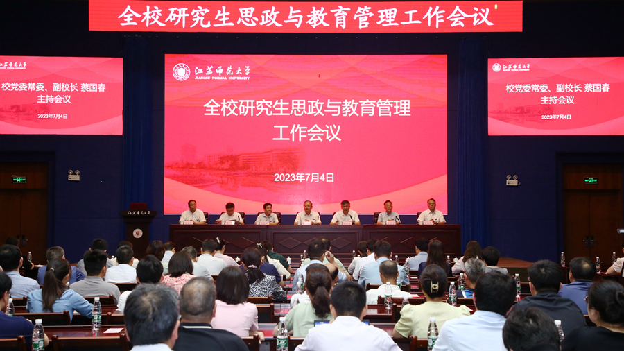 7月4日下午,全校研究生思政與教育管理工作會議在泉山校區分析測試中心100會議室召開。校黨委書記方忠,副校長蔡國春,校黨委常委、組織部部長馬志友,校黨委常委、宣傳部部長孟召學,校黨委常委、黨委辦公室主任、統戰部部長商亮出席會議。各研究生培養單位黨委書記,學院研究生教育管理工作組全體成員,“研究生就業促進項目”、“中國研究生創新實踐系列大賽”校內立項單位負責人,我校獲第二屆江蘇省社會實踐和志愿服務“十佳研究生”、“十佳研究生團隊”榮譽稱號的研究生代表,研究生院全體人員參加會議。會議由蔡國春主持。