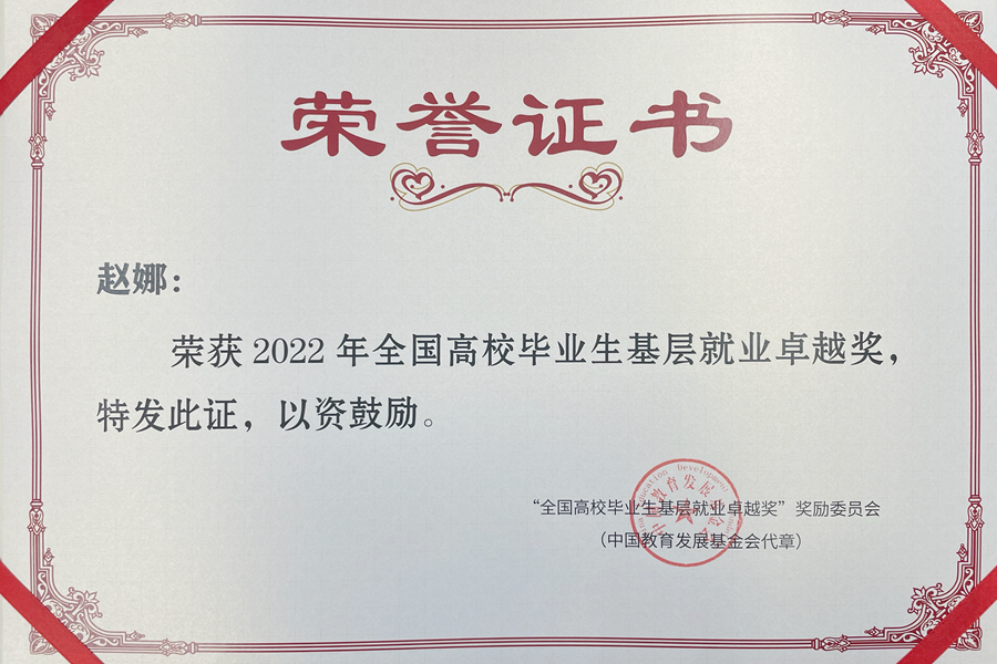 6月28日,中國教育發(fā)展基金會公布首屆“全國高校畢業(yè)生基層就業(yè)卓越獎”獲獎人員名單,我校2016屆語言科學與藝術(shù)學院畢業(yè)生趙娜位列其中。