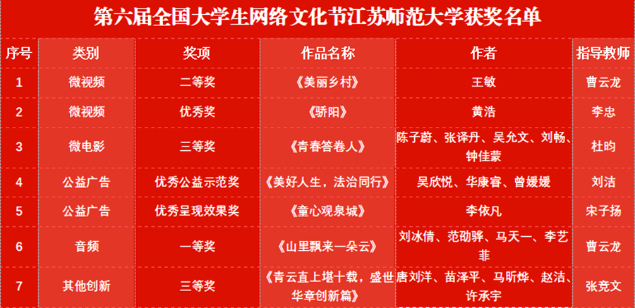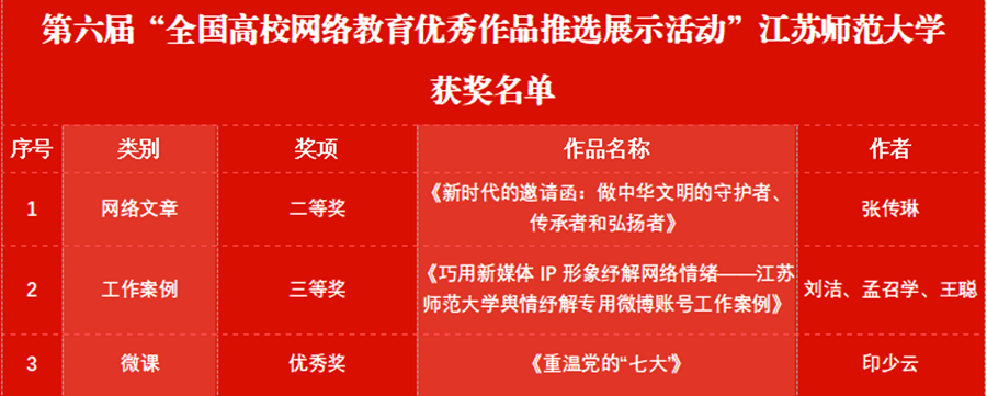 近日,由教育部思想政治工作司、中央網(wǎng)信辦網(wǎng)絡(luò)社會(huì)工作局聯(lián)合主辦的第六屆“全國大學(xué)生網(wǎng)絡(luò)文化節(jié)”和“全國高校網(wǎng)絡(luò)教育優(yōu)秀作品推選展示活動(dòng)”(簡稱“一節(jié)一推選”)遴選結(jié)果公布。在本次大賽中,我校斬獲國家級“優(yōu)秀組織獎(jiǎng)”,學(xué)校師生共榮獲國家級獎(jiǎng)項(xiàng)10個(gè),總獲獎(jiǎng)數(shù)位居全省高校第三(南京大學(xué)和南京師范大學(xué)分列第一、第二),取得歷史性突破。