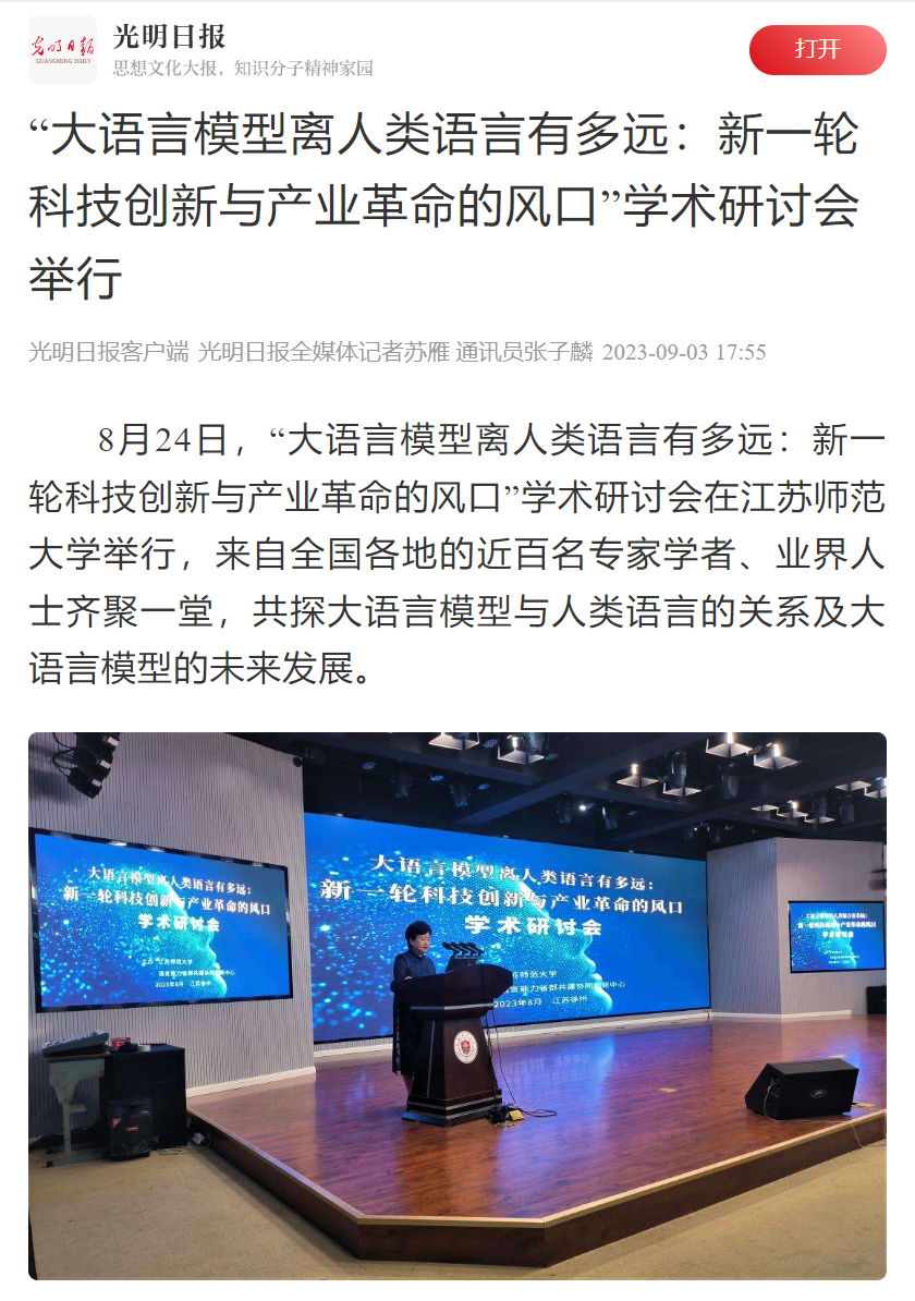 光明日?qǐng)?bào)客戶端9月3日?qǐng)?bào)道我校舉行的“大語(yǔ)言模型離人類語(yǔ)言有多遠(yuǎn):新一輪科技創(chuàng)新與產(chǎn)業(yè)革命的風(fēng)口”學(xué)術(shù)研討會(huì),報(bào)道內(nèi)容如下: