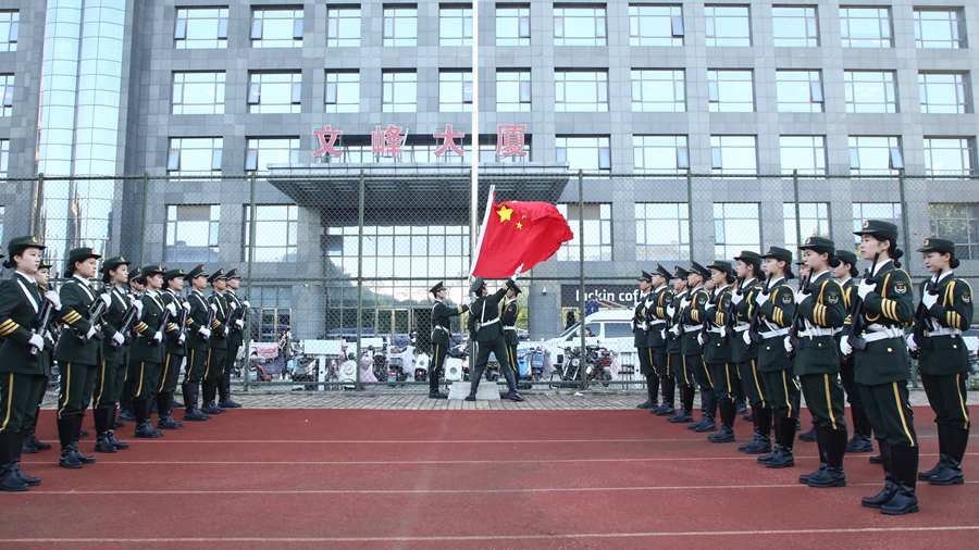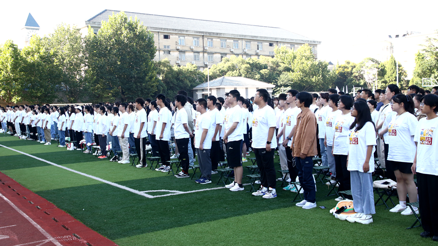 典禮開始前舉行了升國旗儀式。鮮艷的五星紅旗在國旗班的護衛下,從田徑場上空冉冉升起。師生們全體起立,高唱國歌,向國旗行注目禮。