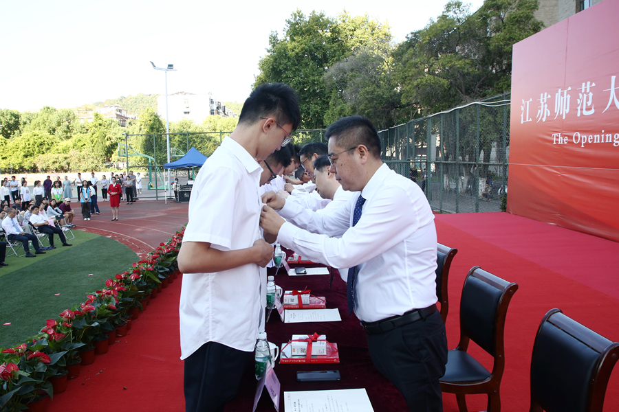 千里奔赴為求學,從此鐫刻蘇師人。江蘇師范大學2023級學生,辭別父母,離別家鄉,結緣師大,從此就像他們佩戴的校徽一樣,“江蘇師范大學”這六個字將深深鐫刻在他們的心中。在全體校領導為學生代表佩戴校徽這一刻,臺下的所有2023級學生也將他們手中的江蘇師范大學校徽佩戴在自己的胸口,成為江蘇師大的一份子。