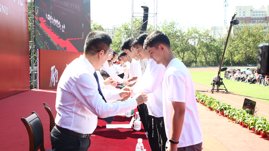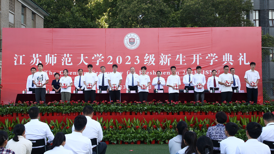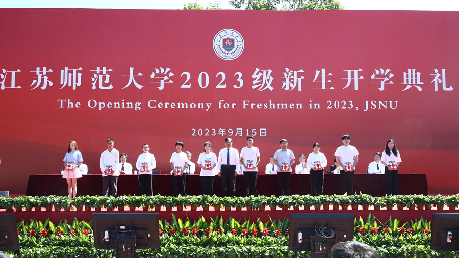 2023級學生中,有很多杰出代表,其中包括了少數民族、青海師大來校交流、研究生入學考試單科最高分同學,今年因抗洪救災,在部隊立功受獎的同學。正是由千千萬萬不同地區、不同境遇的學子,組成了江蘇師范大學這樣一個溫暖的大家庭。副校長杜增吉代表學校向優秀新生代表贈送了開學禮物。