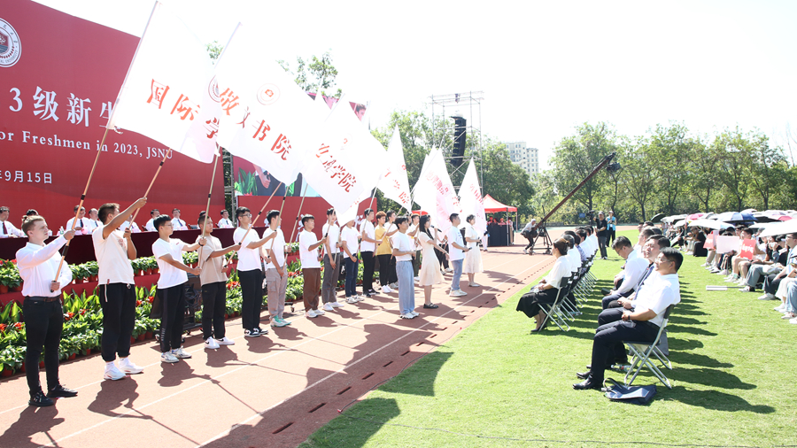 旗幟是精神的象征,是前進的指引,是血脈的傳承。在典禮上,24位學院黨政負責人將象征著學院精神傳承的24面旗幟鄭重交到新生代表的手中。24面院旗迎風飄揚,昭示著青春與力量。