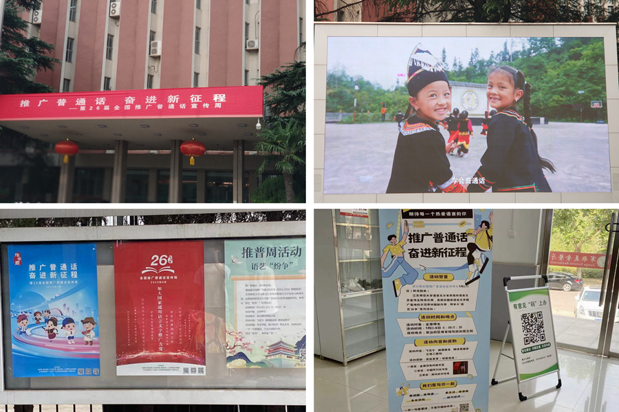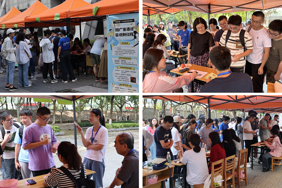 推普周期間,校語委通過在鐘樓懸掛推普主題宣傳橫幅,在閱報欄和各學院張貼宣傳海報,在電子屏滾動播放推普宣傳海報和推普公益廣告等線上線下相結合的方式,營造了濃厚的宣傳氛圍。9月9日至10日,恰逢2023級新生報到,校語委將語藝社精心設計的推普周活動宣傳“易拉寶”,擺放在校園巴士候車點及學生餐廳等地,讓“推普”與新生“不期而遇”、“美麗邂逅”。一種關于語言、關于文字的情緒和悸動,悄然氤氳校園。