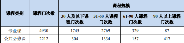 全校開設課程總門數 2020-2021學年,學校開設本科生專業課 2868 門、4930 門次;開設本科公共必修課 108 門、2212 門次。 實踐教學學分占總學分比例 學科實踐教學課程學分占總學分比例分別為:農學: 36.02%;歷史學:17.28%;哲學:23.12%;工學:29.97%;教育學:34.27%;文學: 19.92%;法學:22.50%;理學:28.39%;管理學:22.48%;經濟學:22.29%;藝術學: 32.27%。 選修學分占總學分比例 各學科選修課學分占總學分比例分別為:經濟學:25.64%;法學:18.43%;教育學: 25.36%;文學:23.29%;歷史學:18.85%;理學:20.25%;工學:16.10%;農學:20.45%; 管理學:27.28%;藝術學:21.20%;哲學:22.40%。 課堂規模 2020-2021 學年 堅持以中小型開課班為主的課堂教學模式,保證課堂教學的質量,課程規模情況如表所示。 2020-2021 學年課程規模情況