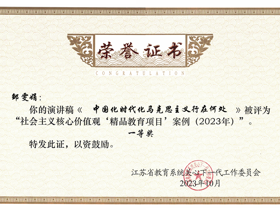 近日,江蘇省教育系統關心下一代工作委員會公布了2023年“社會主義核心價值觀精品教育項目案例”評選結果(蘇教關委〔2023〕7號文),我校關工委報送的《中國化時代化馬克思主義行在何處》項目,榮獲高校組一等獎(全省排名第一),這是自2018年以來我校連續第六年獲得該評選活動的最高獎項。