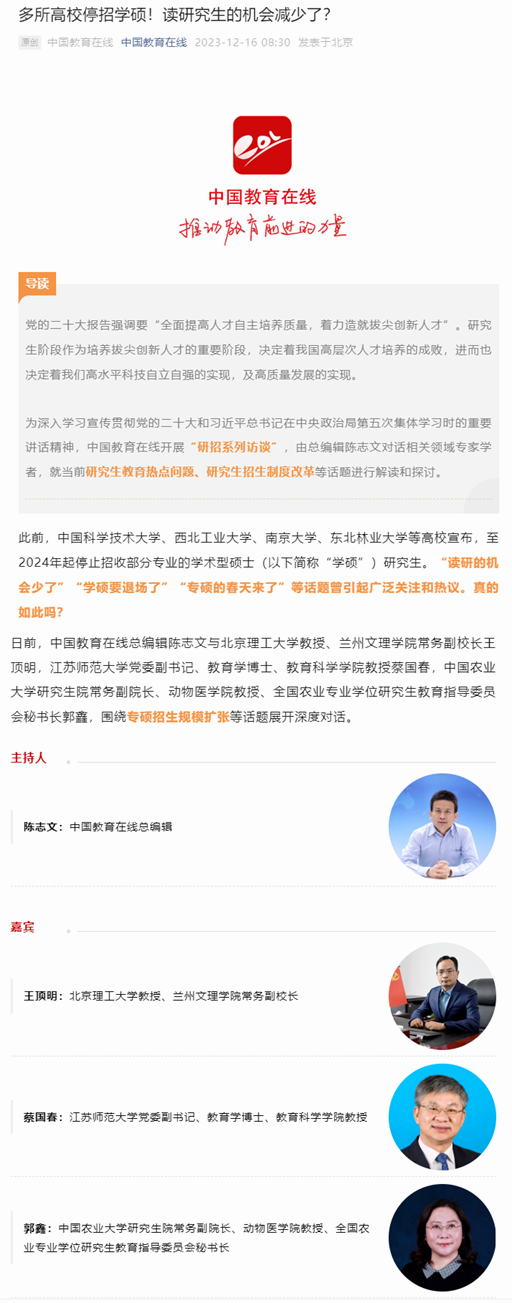 2023年12月16日中國教育在線以“多所高校停招學碩!讀研究生的機會減少了?”為題,綜合采訪我校黨委副書記蔡國春等知名教育專家,談研究生招生政策。報道內(nèi)容如下: