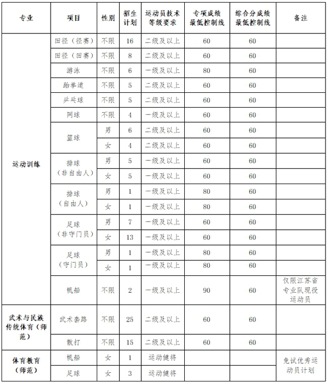 1.運動訓練。面向全國計劃招生90人。招生項目:田徑、游泳、足球(十一人制)、籃球(五人制)、排球、乒乓球、跆拳道、網(wǎng)球、帆船。