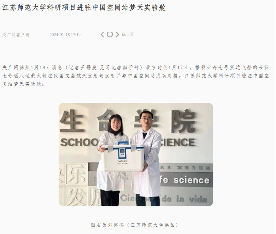 1月19日央廣網(wǎng)報道我校劉偉杰教授團隊研究成果入駐空間站,報道內(nèi)容如下:
