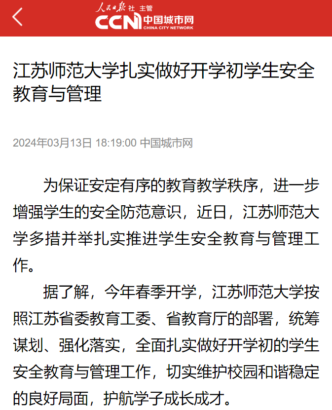 據(jù)了解,今年春季開學(xué),江蘇師范大學(xué)按照江蘇省委教育工委、省教育廳的部署,統(tǒng)籌謀劃、強(qiáng)化落實(shí),全面扎實(shí)做好開學(xué)初的學(xué)生安全教育與管理工作,切實(shí)維護(hù)校園和諧穩(wěn)定的良好局面,護(hù)航學(xué)子成長成才。