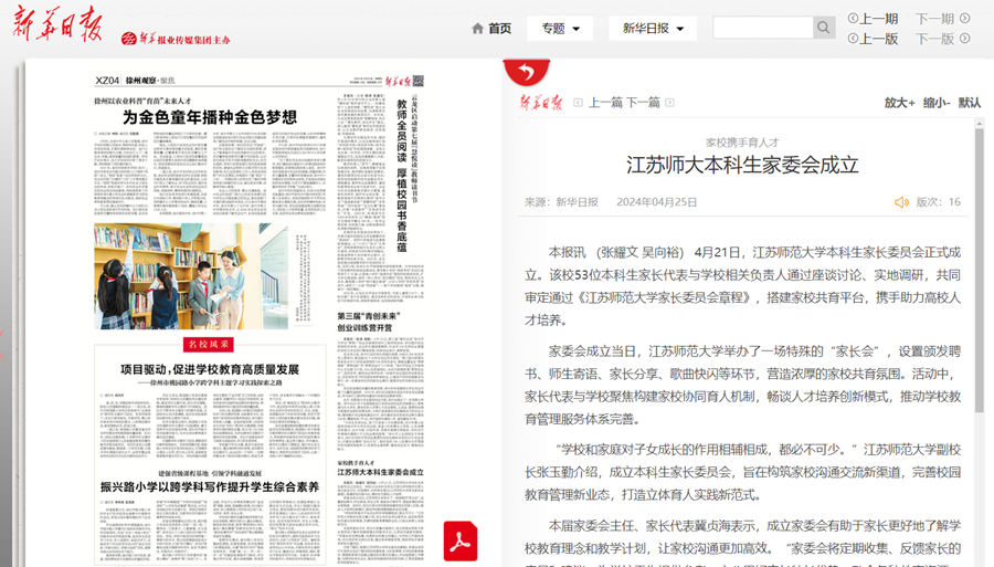 新華日報4月25日報道我校成立家長委員會,報道內容如下: