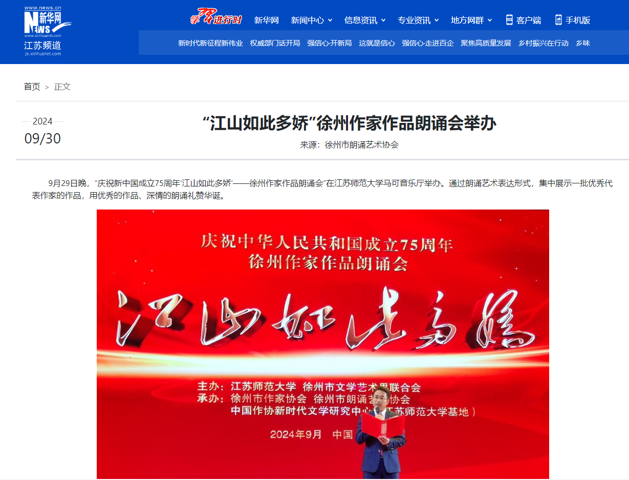 9月30日新華日報客戶端報道我校舉辦的“慶祝新中國成立75周年‘江山如此多嬌’——徐州作家作品朗誦會”,報道內容如下: