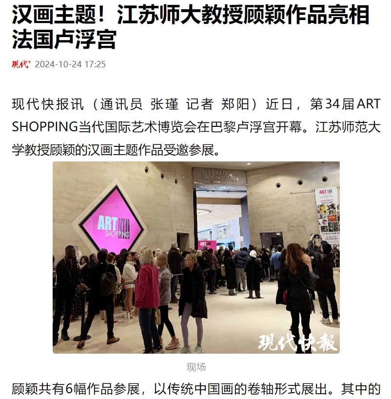 現(xiàn)代快報(bào)訊(通訊員 張瑾 記者 鄭陽(yáng))近日,第34屆ART SHOPPING當(dāng)代國(guó)際藝術(shù)博覽會(huì)在巴黎盧浮宮開幕。江蘇師范大學(xué)教授顧穎的漢畫主題作品受邀參展。