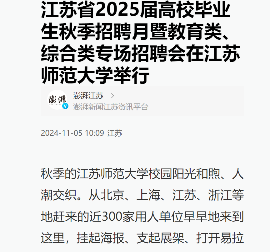 這是以“服務(wù)新質(zhì)生產(chǎn)力,校地強(qiáng)鏈促就業(yè)”為主題的江蘇省2025屆高校畢業(yè)生秋季招聘月暨教育類(lèi)、綜合類(lèi)專(zhuān)場(chǎng)招聘會(huì)的招聘現(xiàn)場(chǎng)。據(jù)悉,此次招聘會(huì)由江蘇省教育廳、江蘇省人力資源與社會(huì)保障廳等單位主辦,江蘇省高校招生就業(yè)指導(dǎo)服務(wù)中心和江蘇師范大學(xué)承辦,共為畢業(yè)生提供了11000余個(gè)職位。