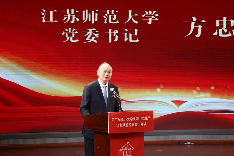 方忠在會(huì)上致辭,對來自全省兄弟院校領(lǐng)導(dǎo)和師生代表表示熱烈歡迎,對讀書節(jié)的圓滿閉幕表示熱烈祝賀。他表示,閱讀是人類獲取知識、啟智增慧、培養(yǎng)道德的主要途徑,是樹立崇高理想、涵養(yǎng)浩然之氣的重要方式。習(xí)近平總書記在致首屆全民閱讀大會(huì)的賀信中指出:“希望全社會(huì)都參與到閱讀中來,形成愛讀書、讀好書、善讀書的濃厚氛圍。”江蘇師大高度重視“書香校園”建設(shè),已連續(xù)舉辦了23屆校園讀書節(jié),打造了一系列具有特色的品牌活動(dòng),在推廣閱讀方面取得一系列成績。學(xué)校將以高標(biāo)準(zhǔn)“書香校園”建設(shè)引領(lǐng)推動(dòng)全民閱讀事業(yè)發(fā)展,促進(jìn)全民閱讀成為立德樹人、培根鑄魂、啟智增慧的重要途徑。學(xué)校將持續(xù)推動(dòng)大學(xué)生讀書文化節(jié)的發(fā)展繁榮,全面提升文科教育的服務(wù)能力和貢獻(xiàn)水平。