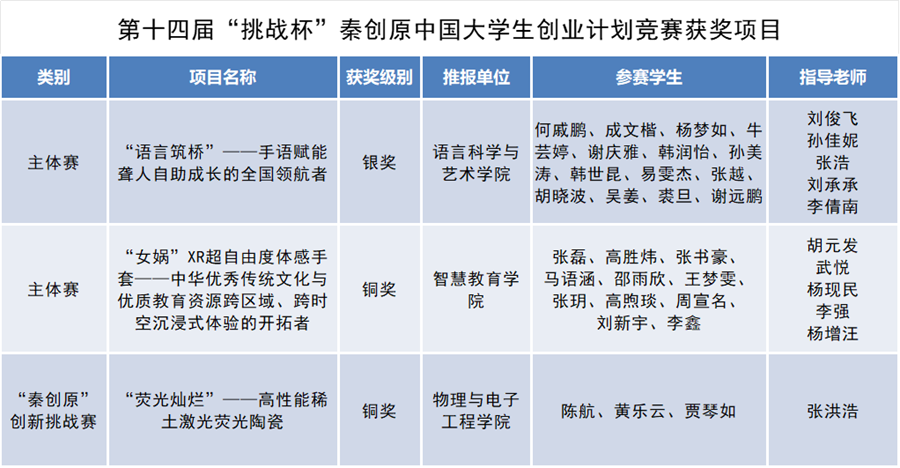 在第十四屆“挑戰(zhàn)杯”秦創(chuàng)原中國(guó)大學(xué)生創(chuàng)業(yè)計(jì)劃競(jìng)賽中,《“語(yǔ)言筑橋”——手語(yǔ)賦能聾人自助成長(zhǎng)的全國(guó)領(lǐng)航者》榮獲主體賽銀獎(jiǎng),《“女?huà)z”XR超自由度體感手套——中華優(yōu)秀傳統(tǒng)文化與優(yōu)質(zhì)教育資源跨區(qū)域、跨時(shí)空沉浸式體驗(yàn)的開(kāi)拓者》榮獲主體賽銅獎(jiǎng),《“熒光燦爛”——高性能稀土激光熒光陶瓷》榮獲“秦創(chuàng)原”創(chuàng)新挑戰(zhàn)賽銅獎(jiǎng)。