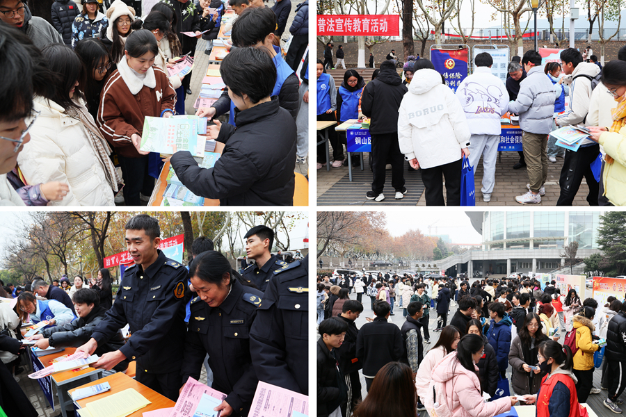 在集中普法宣傳教育活動區(qū),來自銅山區(qū)政法委、司法局、人民法院、人民檢察院、教育局、公安局、應(yīng)急管理局、人力資源和社會保障局等15家單位的普法宣傳員攜手江蘇師范大學(xué)普法志愿者大隊志愿者們面向全校師生開展現(xiàn)場普法宣傳教育活動,內(nèi)容涉及《憲法》《民法典》《反電信網(wǎng)絡(luò)詐騙法》《突發(fā)事件應(yīng)對法》《消費者權(quán)益保護(hù)法》《食品安全法》《勞動法》等領(lǐng)域。在法治游園會活動區(qū)域設(shè)置了法治盲盒、法治視力表、法治留言板、法治套圈、法治連連看等游戲環(huán)節(jié),廣大師生通過參與游戲回答問題、破解法治謎語,掌握憲法知識。活動現(xiàn)場人頭攢動,反響熱烈。