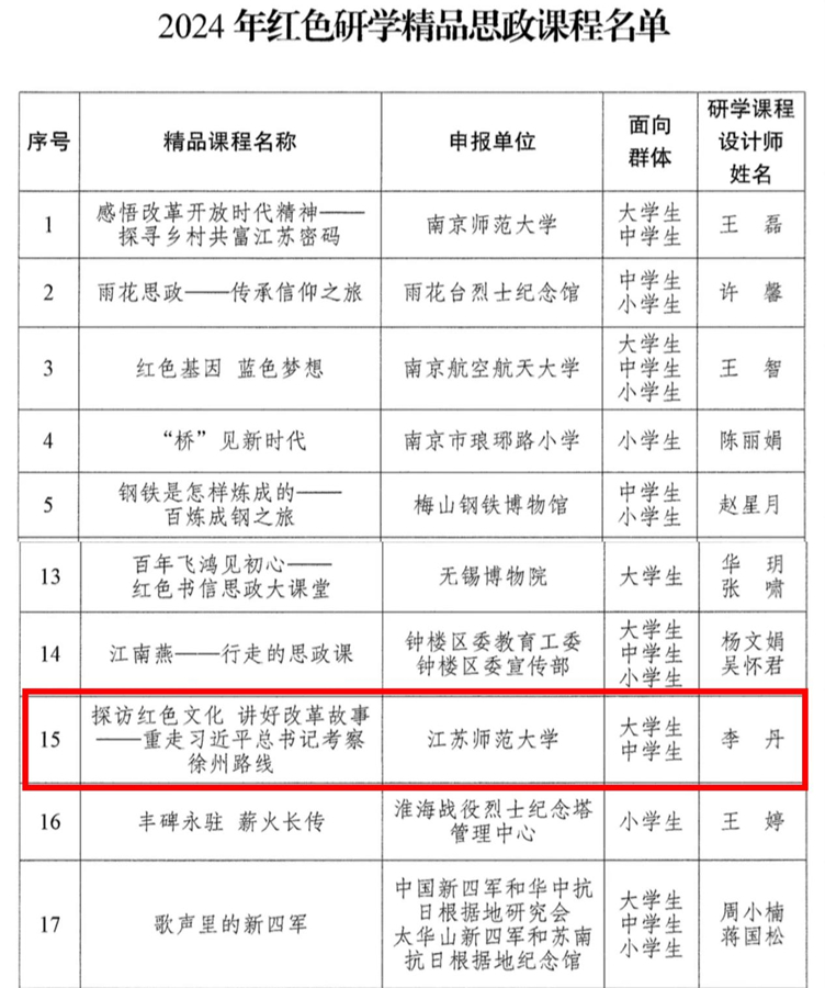 江蘇省文化和旅游廳、江蘇省教育廳和新華日?qǐng)?bào)社聯(lián)合開展的紅色研學(xué)精品思政課程遴選推介活動(dòng)是全面貫徹落實(shí)黨的二十大精神和習(xí)近平總書記對(duì)江蘇工作重要講話重要指示精神,深入學(xué)習(xí)貫徹習(xí)近平文化思想,扎實(shí)推進(jìn)“大思政課”和大中小學(xué)思政課一體化建設(shè)的重要舉措。根據(jù)《關(guān)于組織開展紅色研學(xué)精品思政課程遴選推介活動(dòng)的通知》(蘇文旅發(fā)〔2024〕22號(hào))文件精神,我校認(rèn)真組織遴選工作,鼓勵(lì)教師積極申報(bào)。最終,經(jīng)過省專家綜合評(píng)議,李丹副教授申報(bào)的課程《探訪紅色文化講好改革故事——重走習(xí)近平總書記考察徐州路線》,在全省申報(bào)的102個(gè)課程中脫穎而出,成功入選2024年江蘇省紅色研學(xué)精品思政課程(全省共推選30個(gè),其中高校10個(gè)),實(shí)現(xiàn)了我校紅色研學(xué)精品思政課程新的突破。