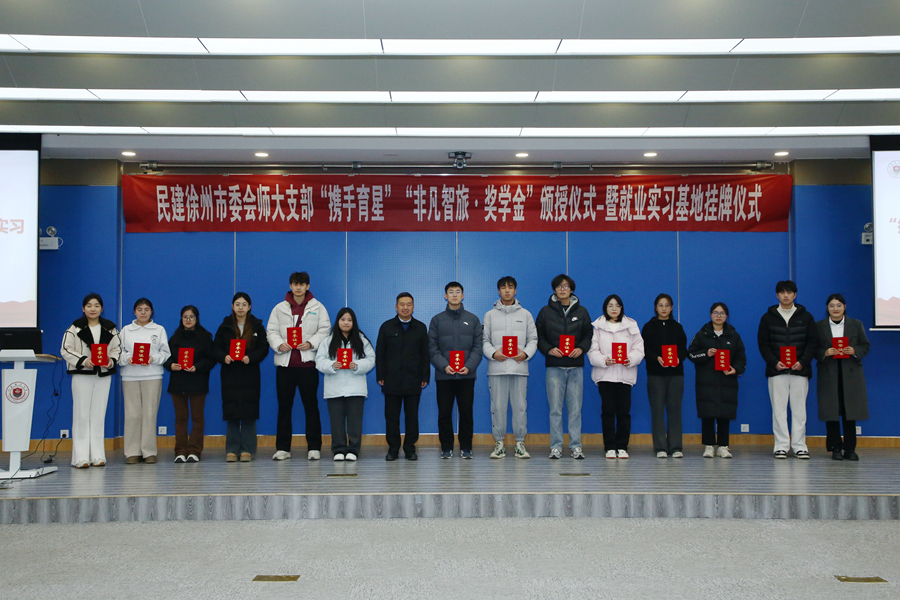 12月11日,民建徐州市委會江蘇師大支部“攜手育星獎學金”頒授暨就業實習基地掛牌儀式在分析測試中心300會議室舉行。民建江蘇省委會副主委、徐州市人民政府副市長、民建徐州市委會主委林斌,校黨委書記芮國強,校黨委常委、組織部部長、統戰部部長黃德志,民建徐州市委會副主委康建榮、孫統賢等出席會議。會議由校黨委副書記蔡國春主持,民建徐州市委會社會服務委員會全體委員,民建徐州市委江蘇師大支部全體會員,學校相關職能部門負責同志和獲獎學生代表參加了活動。