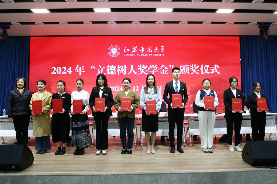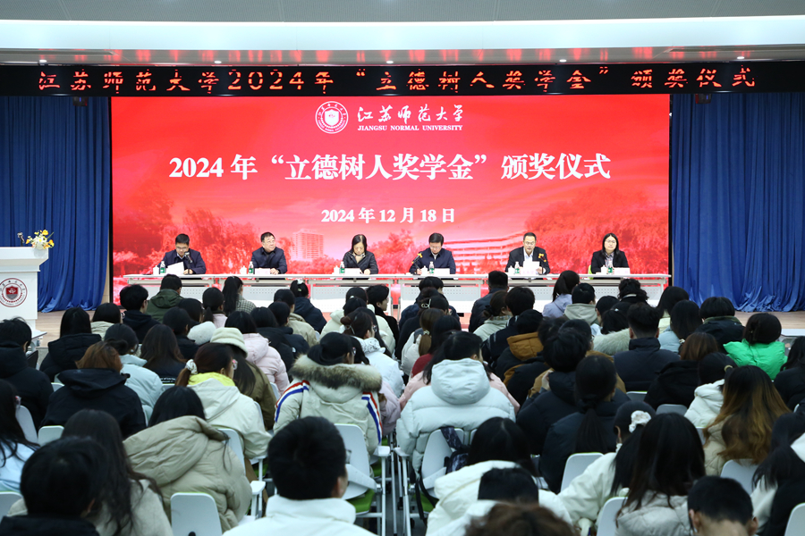 12月18日下午,我校2024年“立德樹人獎學金”頒獎儀式在泉山校區路演大廳舉行。江蘇省教育基金會常務副理事長眭平,校黨委常委、副校長商亮,江蘇省教育基金會副秘書長陳虎,以及相關職能部門負責人出席會議,全體獲獎同學及各學院輔導員、學生代表參加了會議。